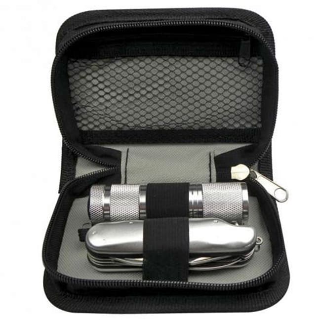 Kit Focus Funciones: Set de 3 piezas. Incluye: Estuche con llavero arnés; Navaja multi-funcional y Linterna