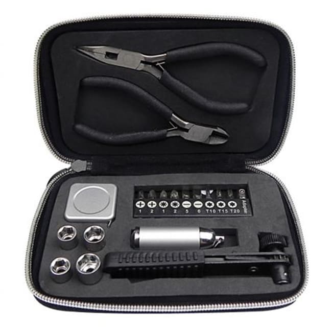 Kit Mustang Funciones: Set de 19 piezas. Incluye : Linterna ; 2 Pinzas ; Juego de 10 puntas ; Cinta Métrica ; 4 Dados y Manguillo