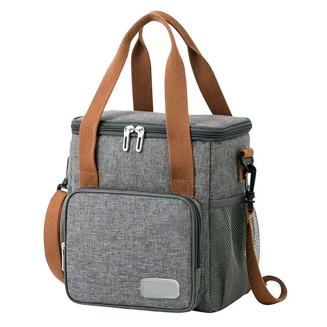 Lunchera Dressel Interior en aluminio insulado. Etiqueta frontal para personalizar. Bolsa al frente con cierre en zipper. Bolsillos laterales en tela mesh. Asa de mano plana y correa larga ajustable. Colores: Gris