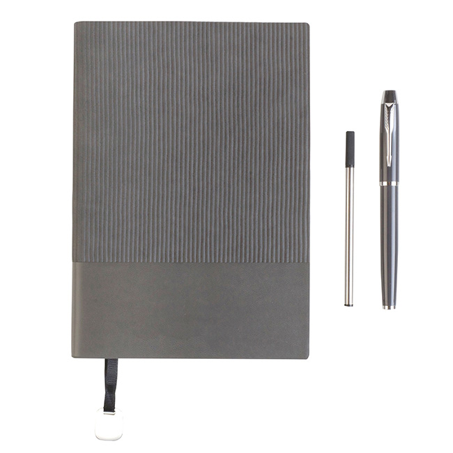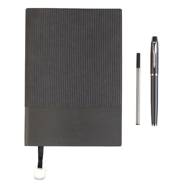Set Kampala Incluye libreta, bolígrafo y estuche de presentación. l Libreta con 90 hojas rayadas tipo planeador atemporal. l Cinta divisoria con remate de placa metálica. l Funcionales cubiertas flexibles con diseño en líneas. l Colores: Gris y Negro
