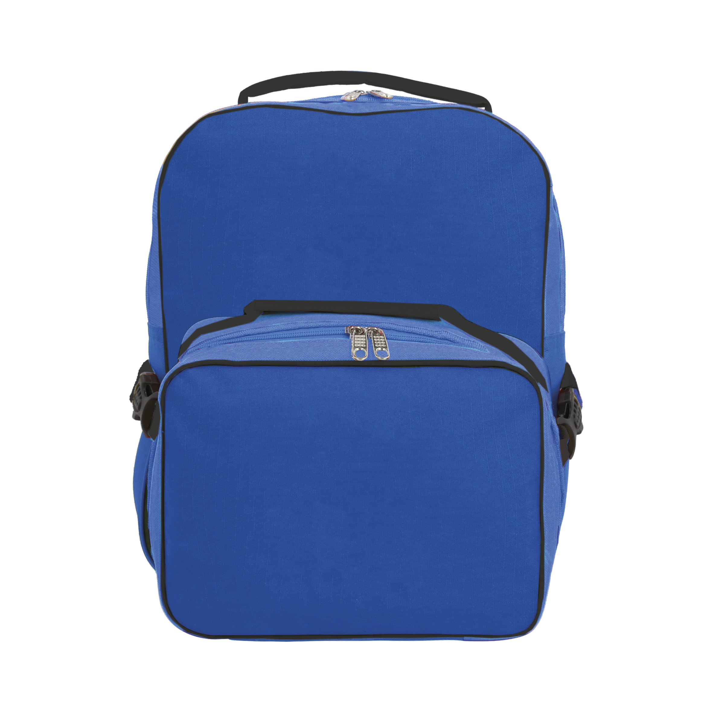 Mochila escolar con compartimento principal, mallas laterales, 1 bolsa frontal y asa. Incluye lonchera.