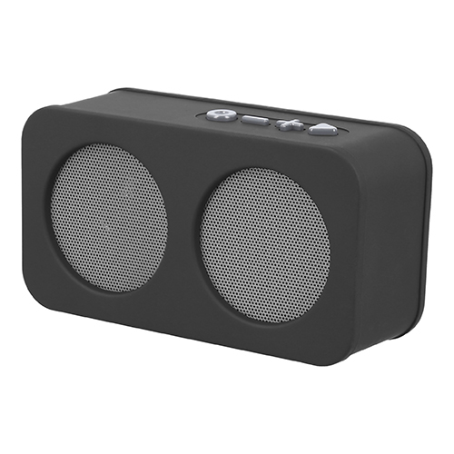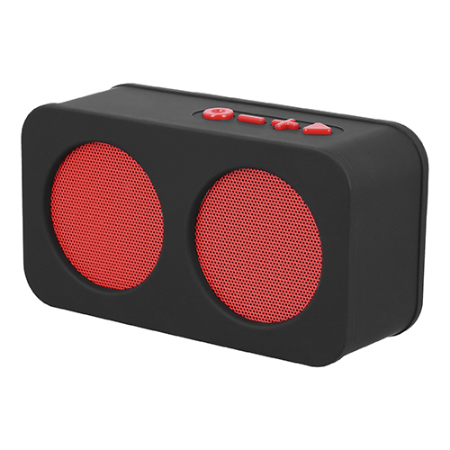Bocina portatil de acabado rubber con Bluetooth, entrada SD, USB, radio FM y botones de color en contraste. Bateria recargable con duracion de 2-3 hrs.