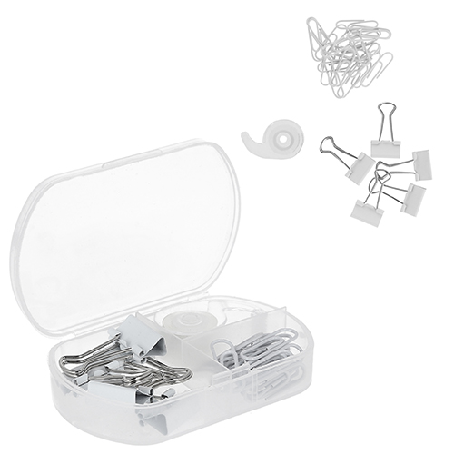 Mini set de oficina. Contiene 10 clips estándar, 5 clips sujetadocumentos y despachador de cinta adhesiva. Incluye estuche de plástico.