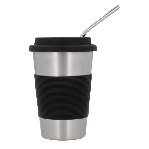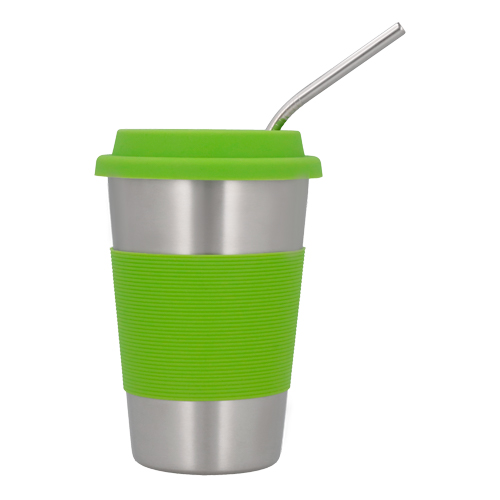 Vaso de acero inoxidable con tapa y cintilla de silicón. Incluye popote.