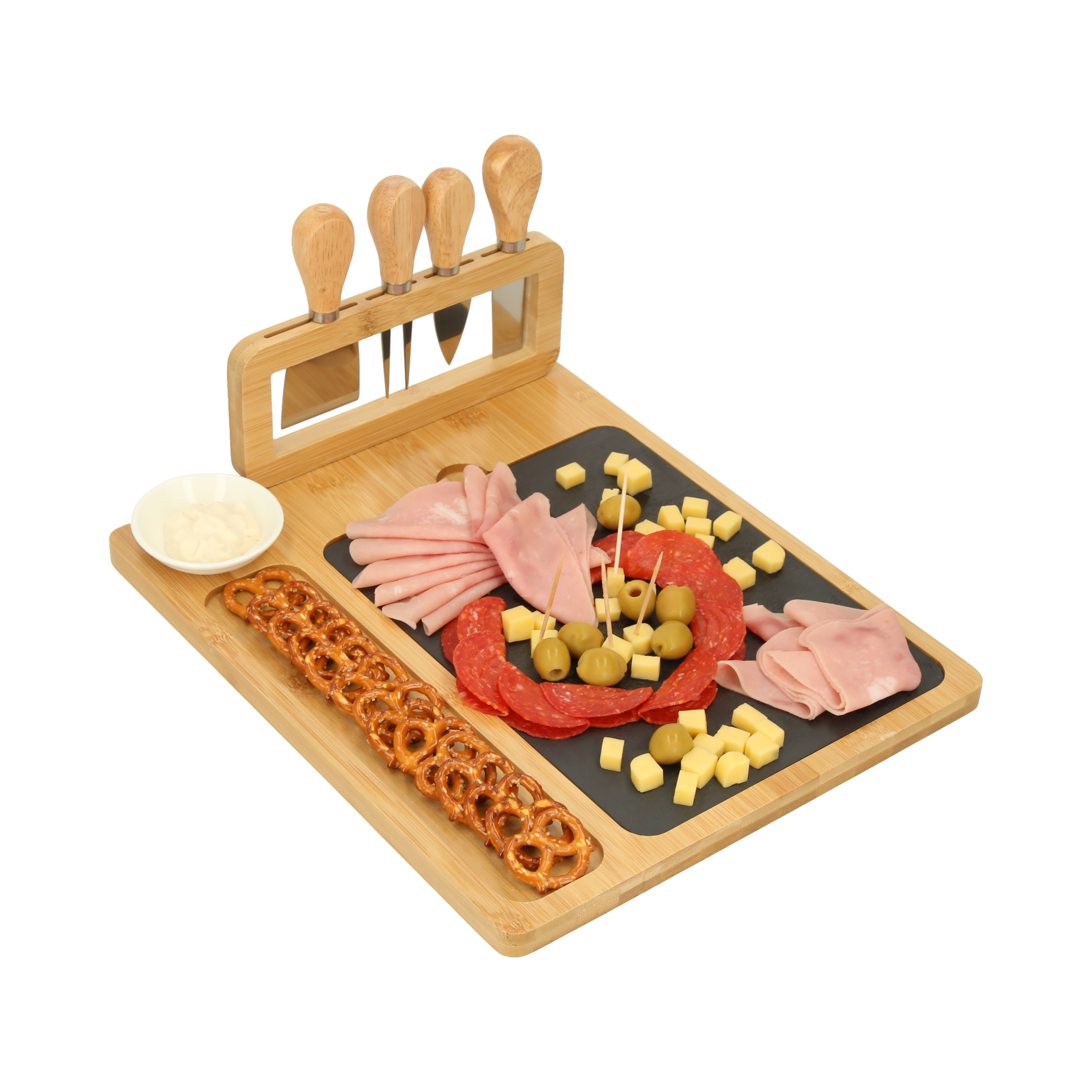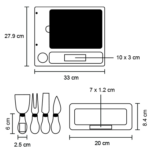 Tabla para quesos con piedra, incluye 1 mini cuchillo de pala, 1 mini tenedor para quesos, 1 cuchillo de avión estrecho, un cuchillo y un mini plato de cerámica.