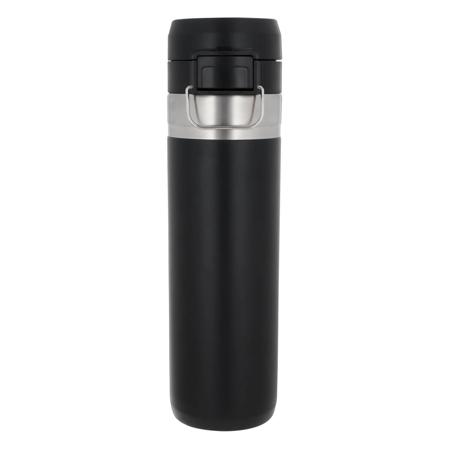 Termo con acabado rugoso, doble pared de acero inoxidable, insulado al vacío, tapa enroscable con candado de seguridad y asa metálica.