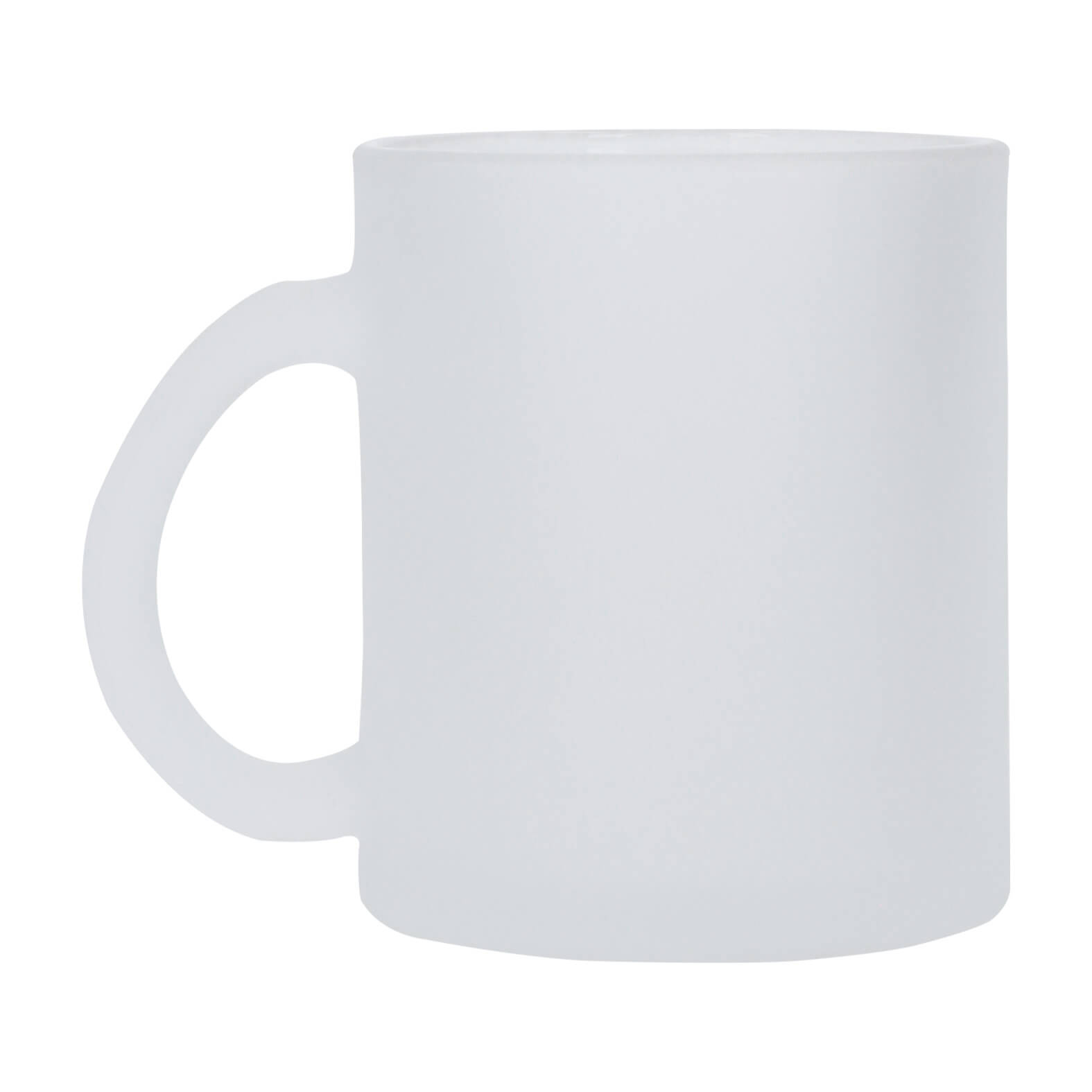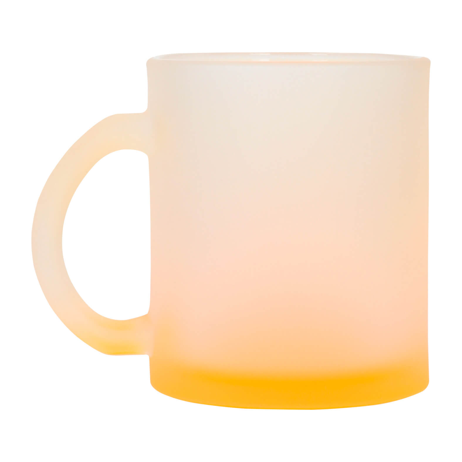 Taza de vidrio sublimable con acabado frost, degradado en la base y asa.