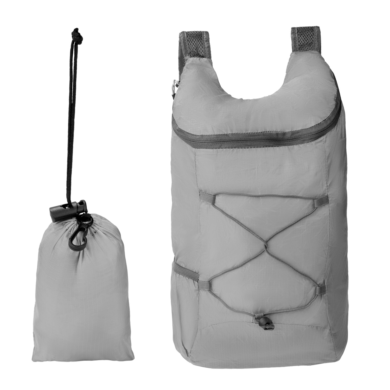 Mochila plegable con compartimento principal con doble cierre, una bolsa lateral con elástico y red frontal para zapatos. Incluye funda para guardar con correa ajustable.