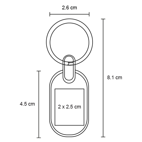 Llavero metálico de placa solida en forma de ovalo con arillo reforzado.
