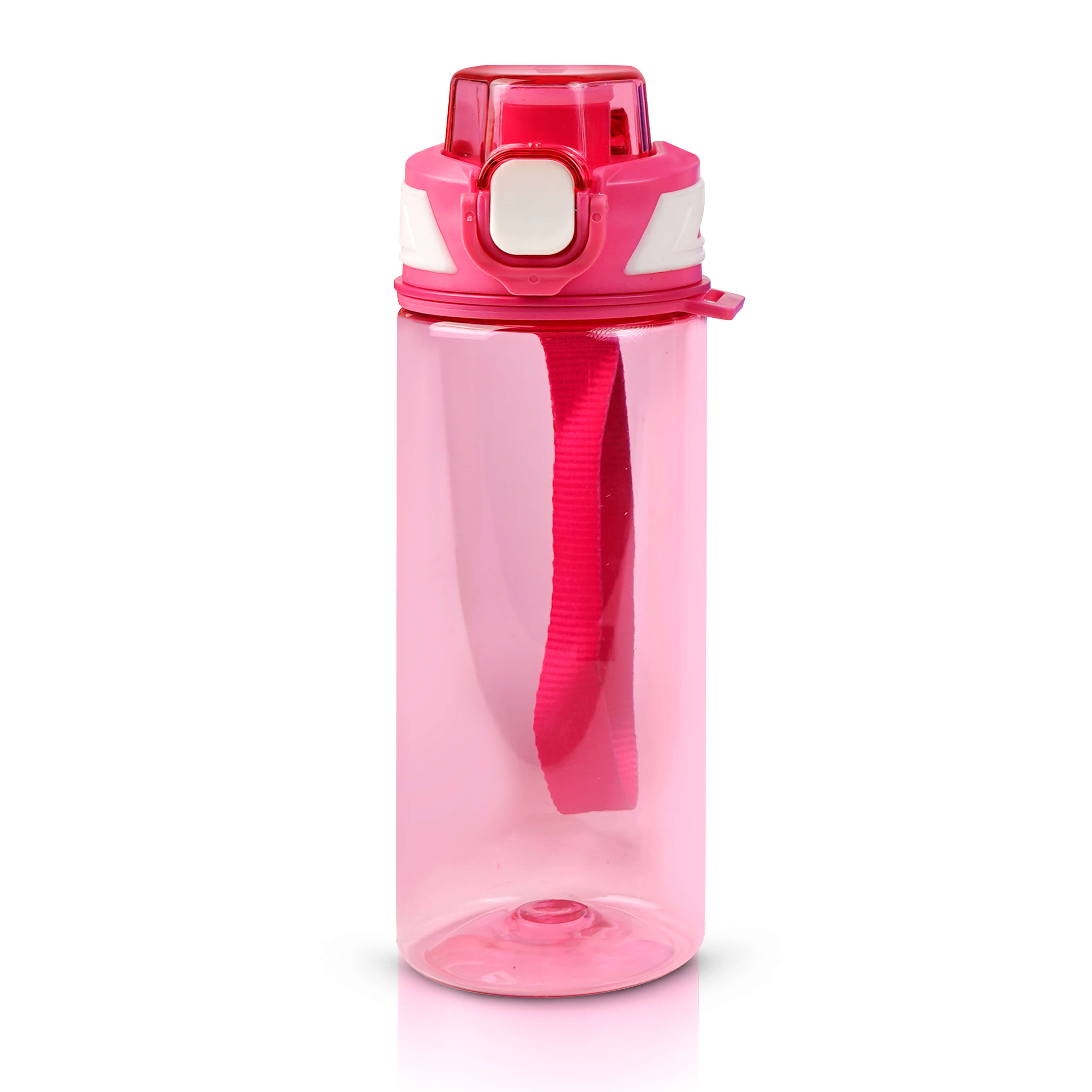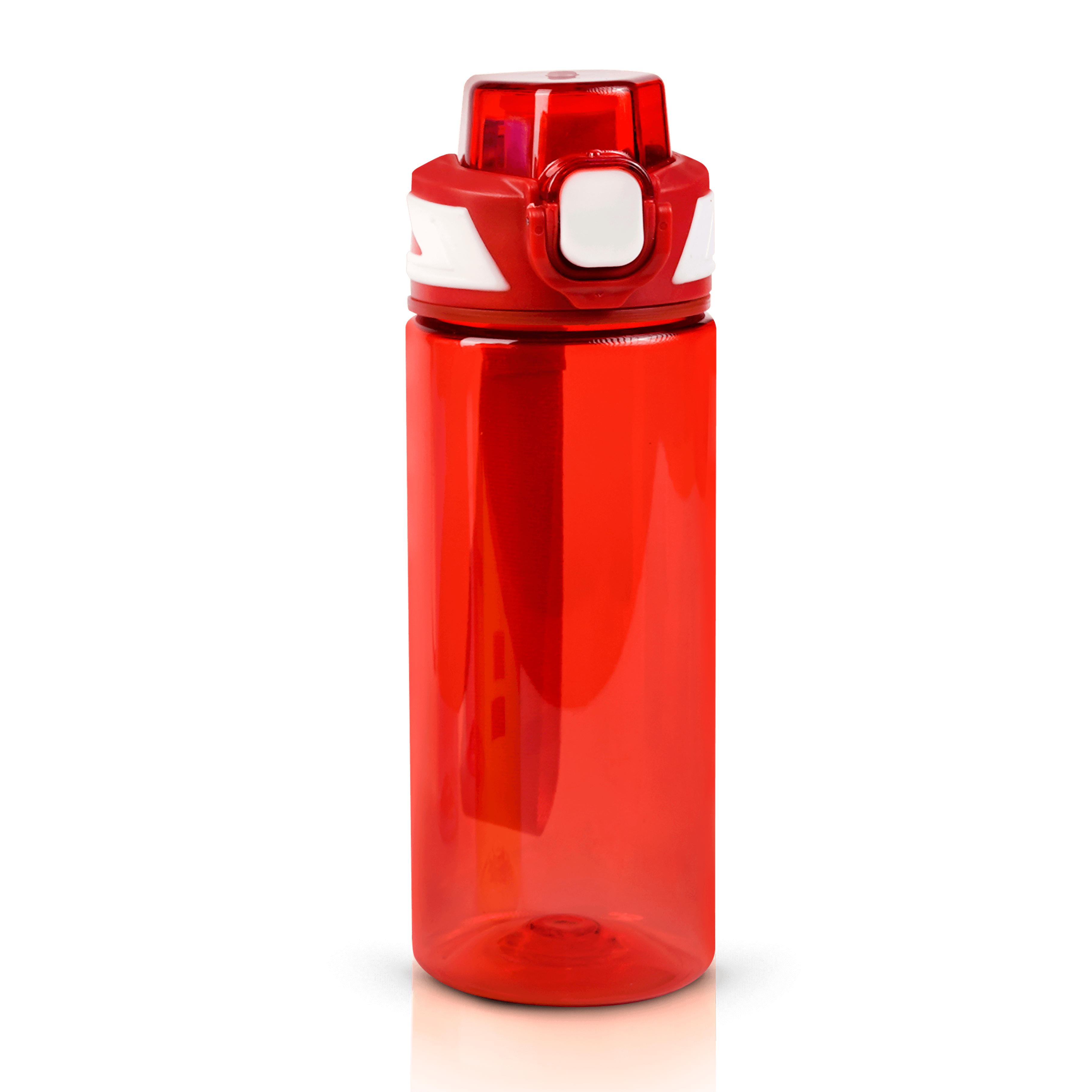 Cilindro de plástico con tapa enroscable, boquilla de seguridad y asa.