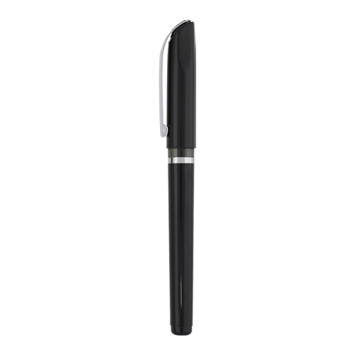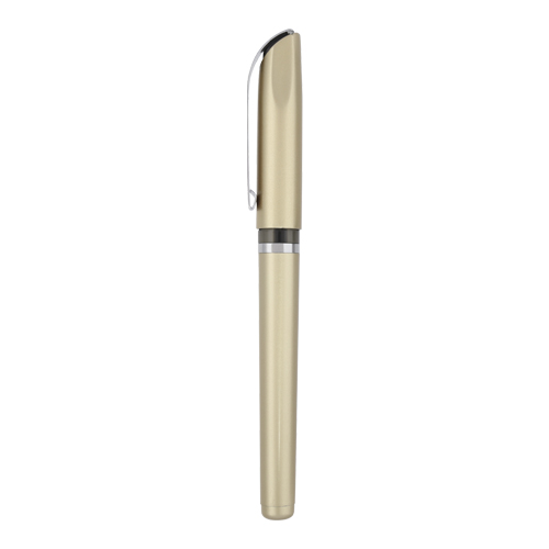 Bolígrafo de plástico con apariencia metálica, tinta gel y clip metálico.