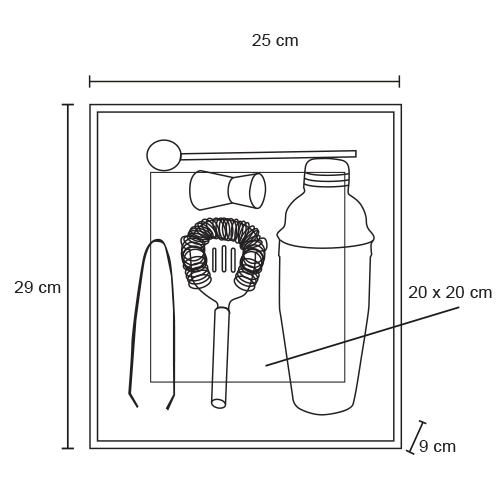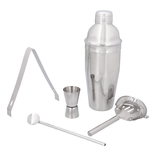 Set para preparación de bebidas. Incluye: shaker, pinzas, medidor, popote con cucharilla incluida y colador/mezclador.
