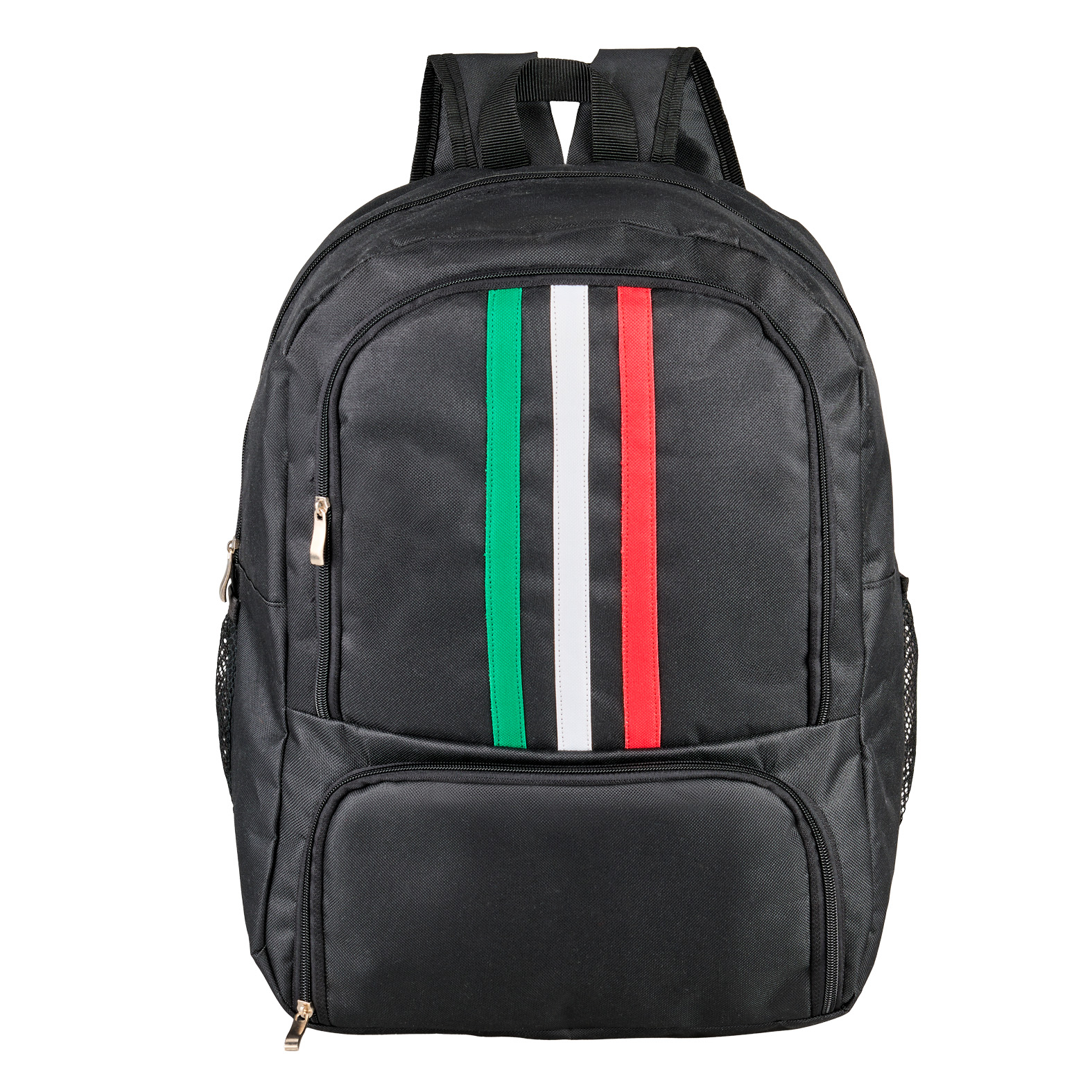 Mochila de poliéster con compartimento principal forrado, acceso rápido frontal, compartimento secundario en la parte baja, respaldo acolchado, tirantes ajustables, mallas laterales y asa superior.