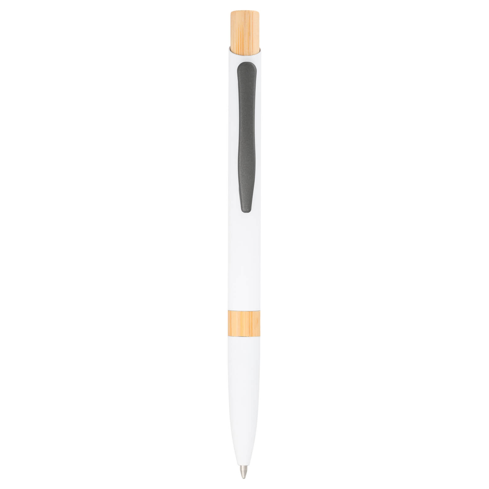 Bolígrafo metálico con acabado rubber, detalle en bambú, clip y mecanismo de click.