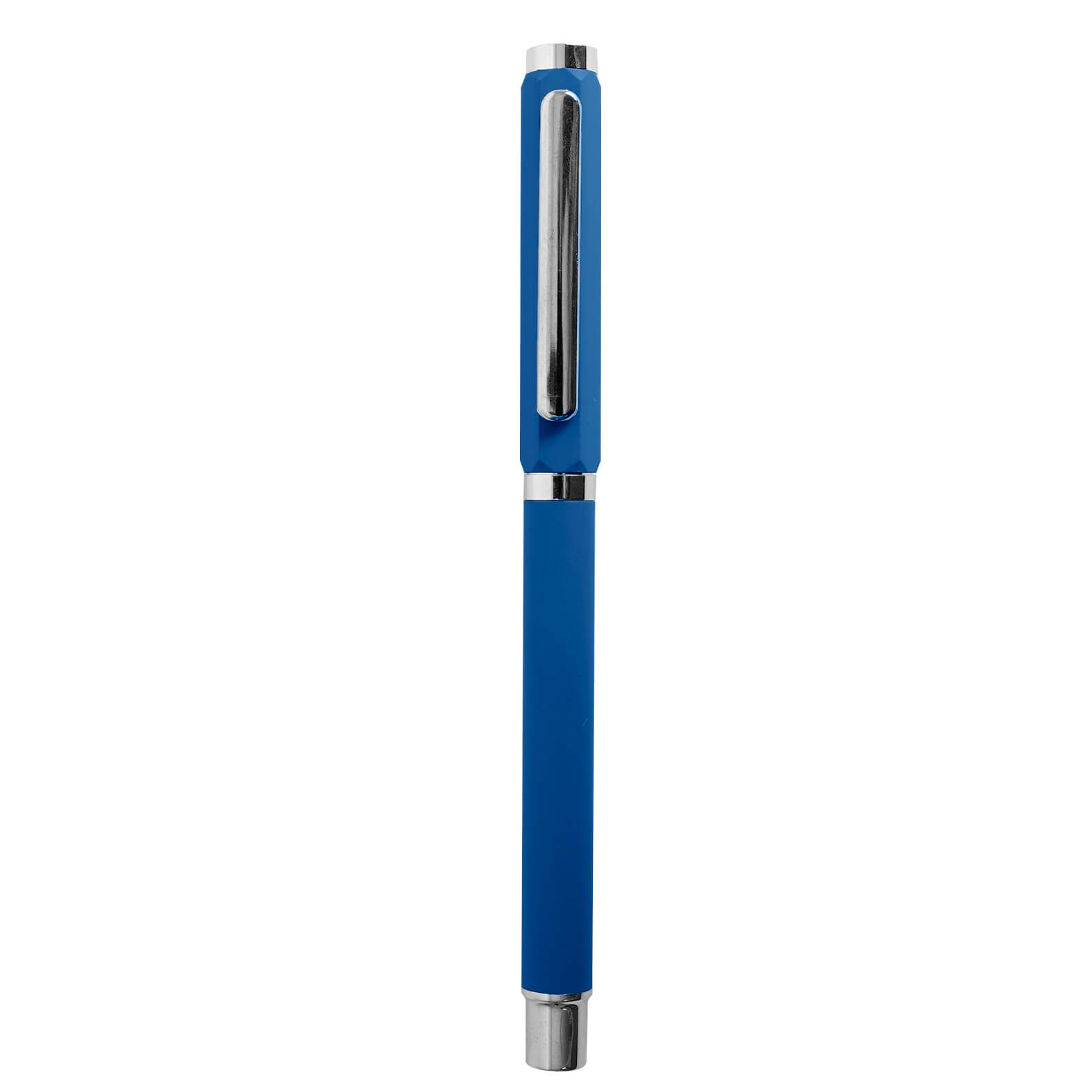 Bolígrafo metálico con acabado rubber, punto roller, tapa con forma hexagonal y clip.