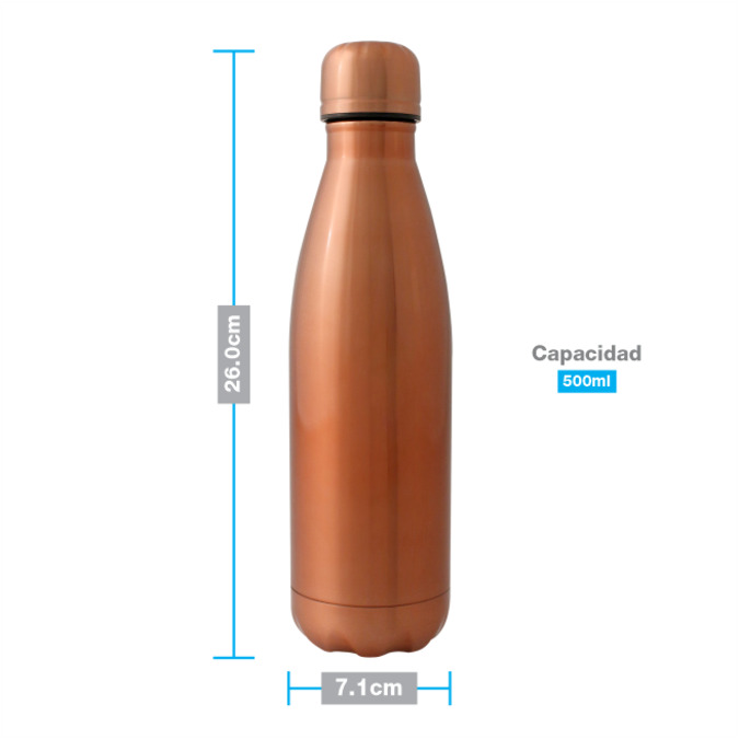 Termo con forma de botella que mantendra tu bebida fria durante 24 horas o caliente durante 12 horas. Acabados mate y de alto brillo. Hecho de acero inoxidable con doble pared. Tapon con sellado de vacio que mantiene fresco el liquido que contenga y evita al 100% cualquier derrame. Se entrega en caja de carton individual. Lavar antes de usar.