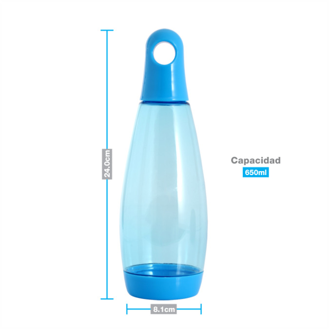 Botella de policarbonato en colores varios. 650 ml. Cuerpo translucido, base y tapa en color solido. Tapa con cierre de rosca. Lavar antes de usar.