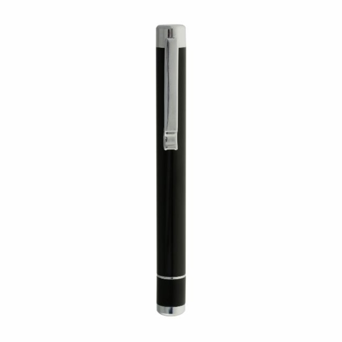 Linterna metalica con apariencia de boligrafo, ideal para colocarla en el bolsillo. Luz led. Disponible en color negro y acero. Detalles cromados. Utiliza 2 baterias AAA (Incluidas). Incluye estuche individual.