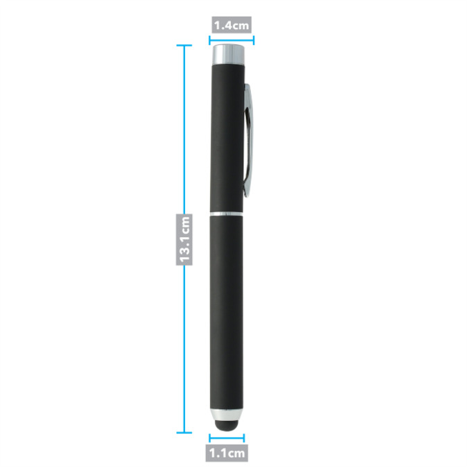 Linterna metalica con apariencia de boligrafo, ideal para colocarla en el bolsillo. Luz led. Disponible en color negro mate y acero. Detalles cromados. Cuenta con touch en el extremo opuesto a la linterna. Utiliza 5 baterias AG3 (Incluidas). Incluye estuche individual.