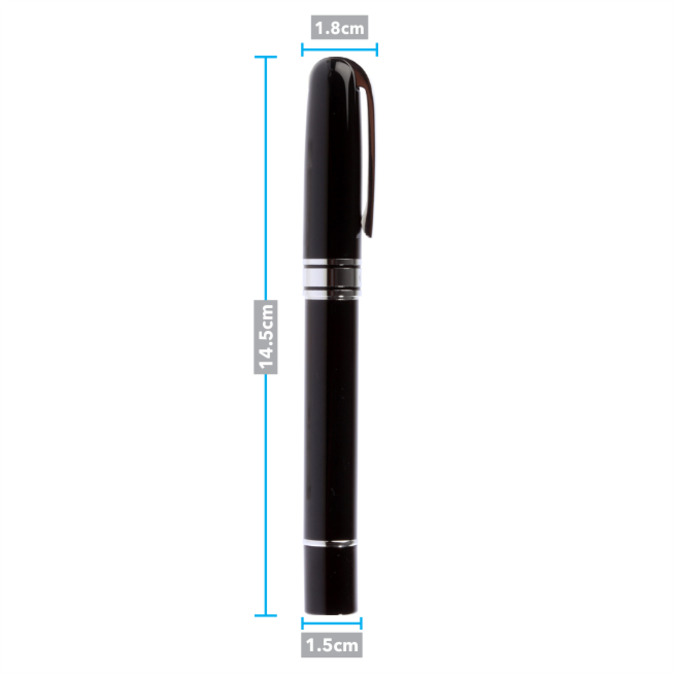 Linterna metalica con apariencia de boligrafo, ideal para colocarla en el bolsillo. Luz led. Disponible en color negro brillante, cromo y acero. Detalles cromados. Utiliza 2 baterias AAA (Incluidas). Incluye estuche individual.