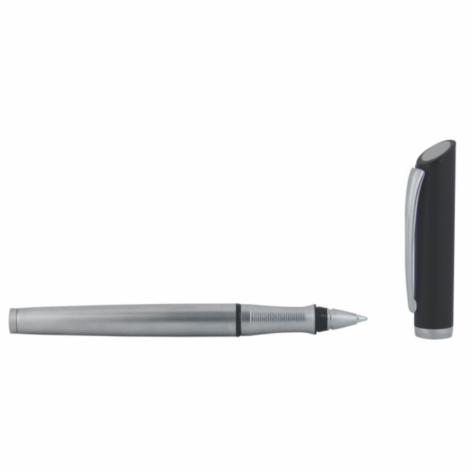 Boligrafo metalico con tapon que cierra a presion. Cuerpo plata y tapon de color mate. Escritura de alto desempe