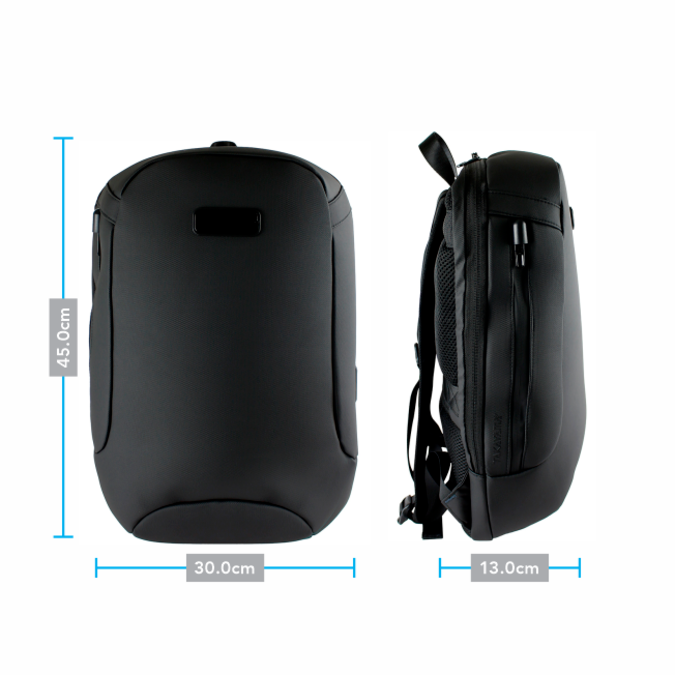 Mochila de diseño alargado y moderno. Mezcla de poliéster balístico con membrana dermalis, una piel vegana de gran suavidad al tacto