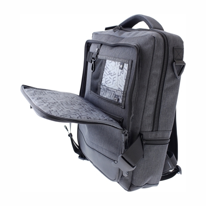 Mochila marca TAKAYAMA. Fabricada en resistente tela gris obscuro. Detalles en curpiel texturizado. Materiales que repelen el agua. Cuenta con doble padding: Hacia el exterior con mayor resistencia al impacto, y hacia el interior con mayor suavidad para proteger el equipo. Bolsa frontal con multi compartimentos para organizar articulos peque