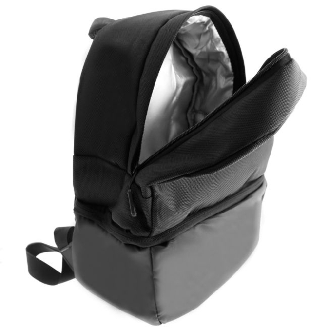 Lonchera fabricada en poliéster y pvc. Materiales de alta resistencia repelentes al agua. Cuenta con 2 amplios espacios independientes, ambos con doble tira cierres. Interiores con aislante térmico 100% lavable. Práctica forma de mochila con asas ajustables que permitirán trasladarla con facilidad. Placa metálica frontal para grabado láser. Capacidad: 13 litros (Inferior 5 lt /Superior 8 lt). Incluye bolsa cubre polvo