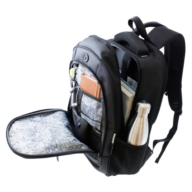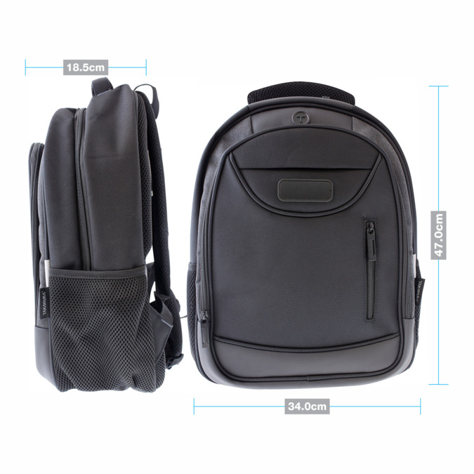 Mochila marca TAKAYAMA, fabricada en poliester de alta resistencia. Detalles en tela y curpiel texturizado. Materiales que repelen el agua. Bolsas laterales con malla. Gran espacio frontal con organizador de accesorios y bolsa de malla con cierre. Compartimento Principal con espacio para Lap Top. Forros interiores con novedoso dise