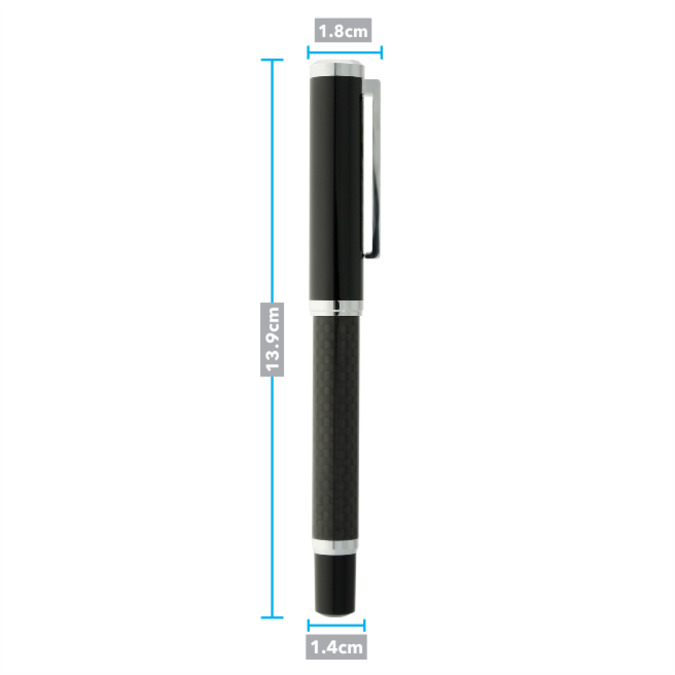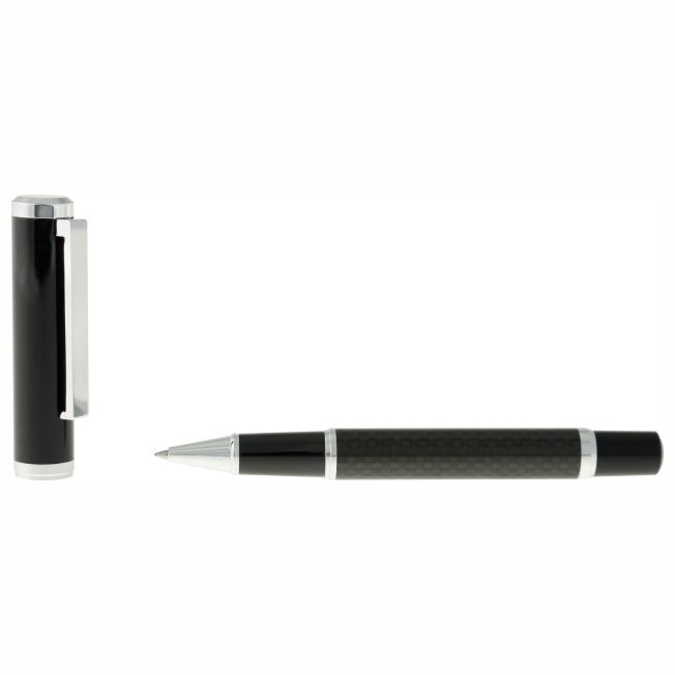 Boligrafo metalico con tapon que cierra a presion. Acabado negro brillante. Detalles color cromo y cuerpo de fibra de carbono que le da ese singular dise