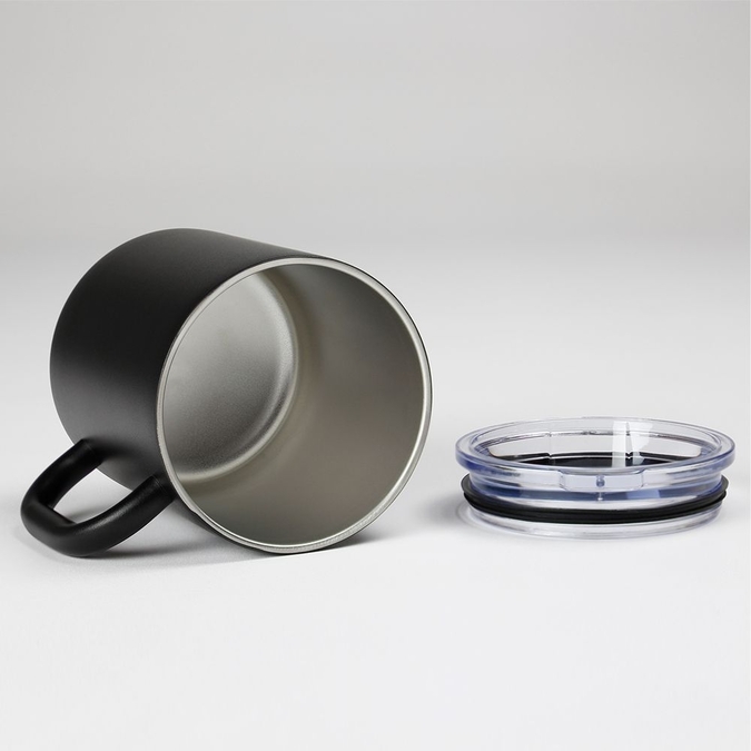 Taza de acero inoxidable de doble pared de 500 ml. Acabado tipo Roca y base de silicón para mejorar la estabilidad. Fabricado en acero inoxidable 304 grado alimenticio con una tapa de policarbonato transparente que además cuenta con una boquilla para facilitar su uso. Recibe cada pieza en una caja de regalo individual fabricada en cartón.