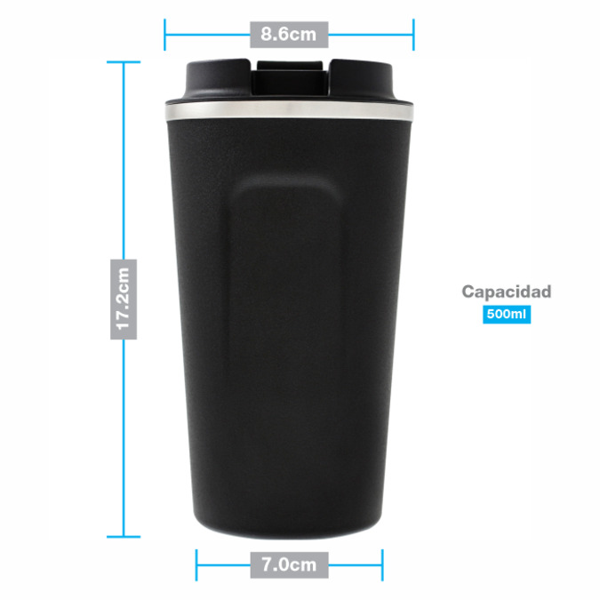 Termo fabricado en acero inoxidable 304. Doble pared con sistema de vacío que te permitirá conservar bebidas frías y calientes hasta por 12 horas. Tapa con cierre de rosca y boquilla de seguridad con apertura 180° de sellado perfecto. Base de silicón antiderrapante y acabado tipo Rock en colores negro, blanco y azul. Incluye caja de cartón individual. Capacidad: 500 ml. Lavar antes de usar.