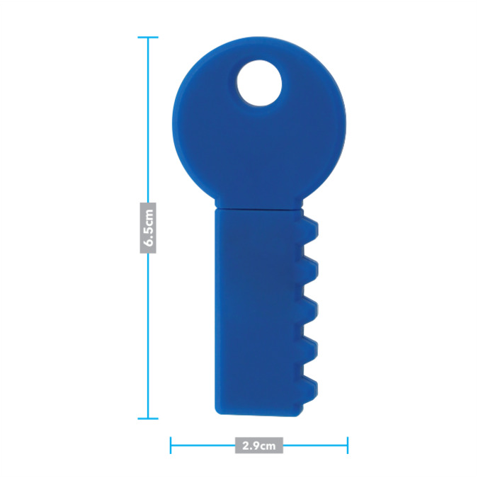 USB de 8GB. Suave cuerpo de silicon hipoalergenico en 2 piezas con forma de llave. Gran area de grabado en bajo relieve. Incluye estuche individual con cierre magnetico.