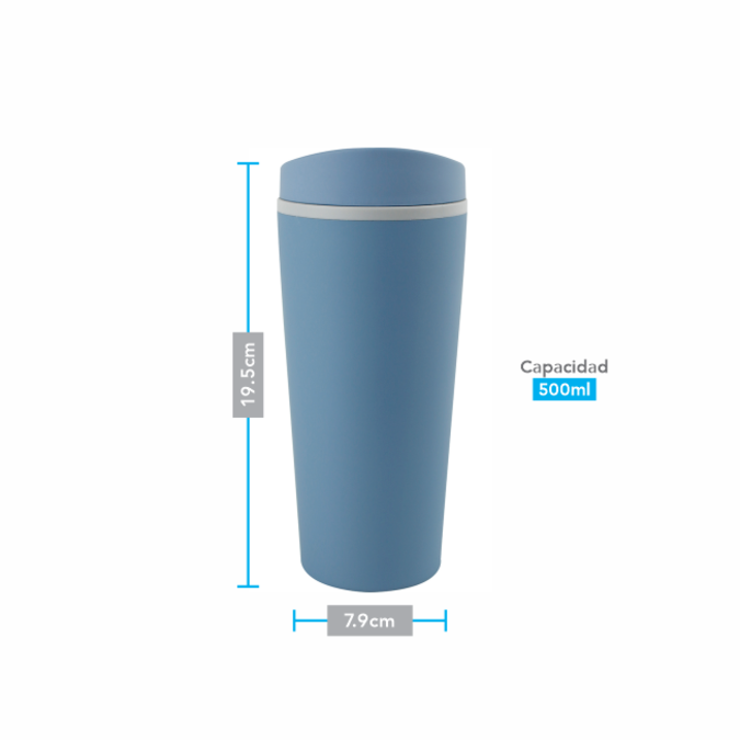 Vaso térmico con acabado satinado de gran suavidad único en la industria. Pared exterior de acero 204 y pared interior en polipropileno grado alimenticio. Capacidad de 500ml.
