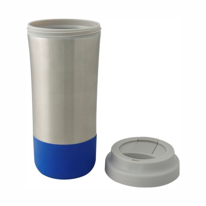 Vaso termico de acero inoxidable e interior plastico de 500 ml. Base de silicon hipoalergenico (colores varios). Tapa con cierre de Rosca y boquilla de seguridad. Se entrega en caja de carton individual. Lavar antes de usar.