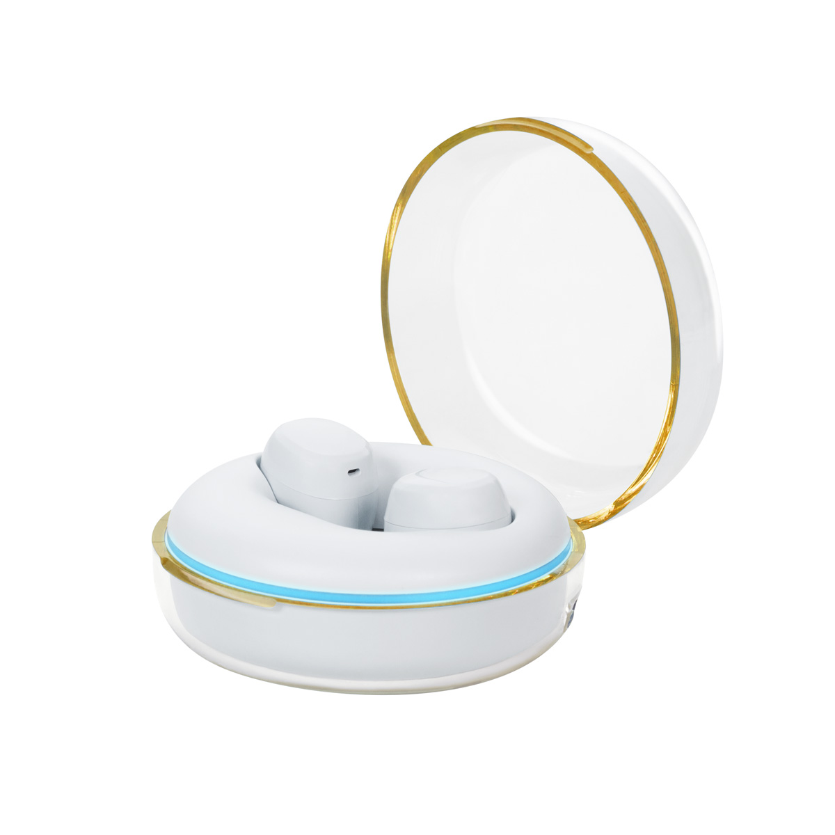 Audifonos bluetooth con base recargable iluminada con luz LED. Controles integrados touch para llamadas, volumen y reproduccion de audio. Reproduccion de musica de 4 a 5 hrs aproximadamente. Rango de conexion de 10 metros. Bateria de 30 mAh en los auriculares y 200 mAh en el estuche de carga. Incluye cable cargador USB, estuche de carga con conexion tipo C y caja individual.