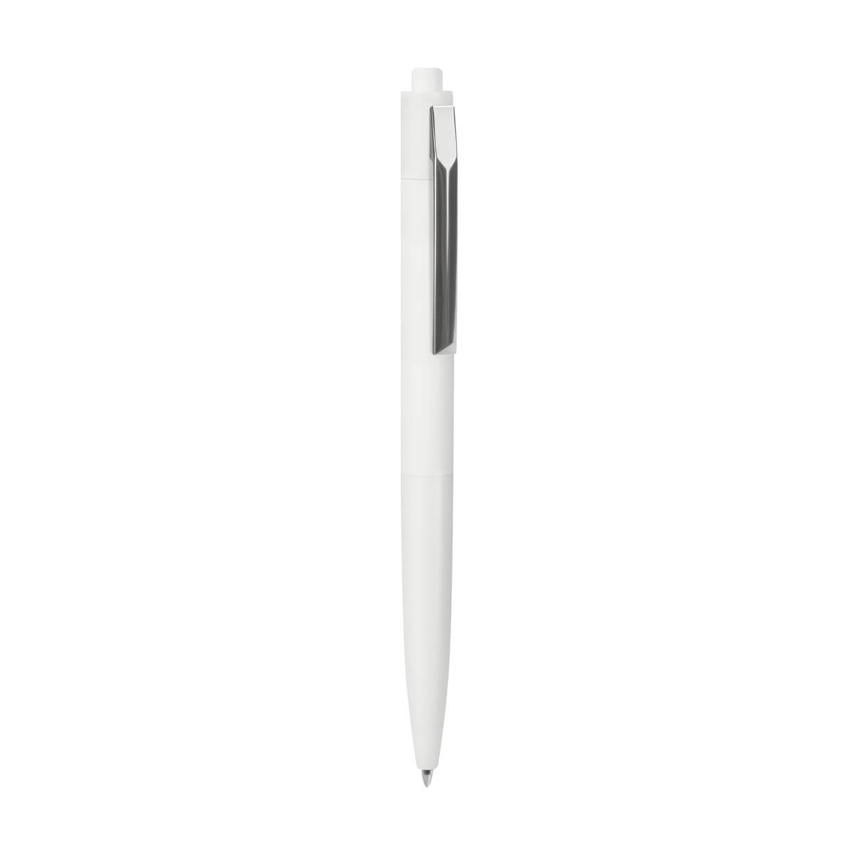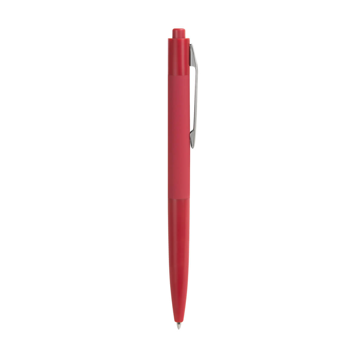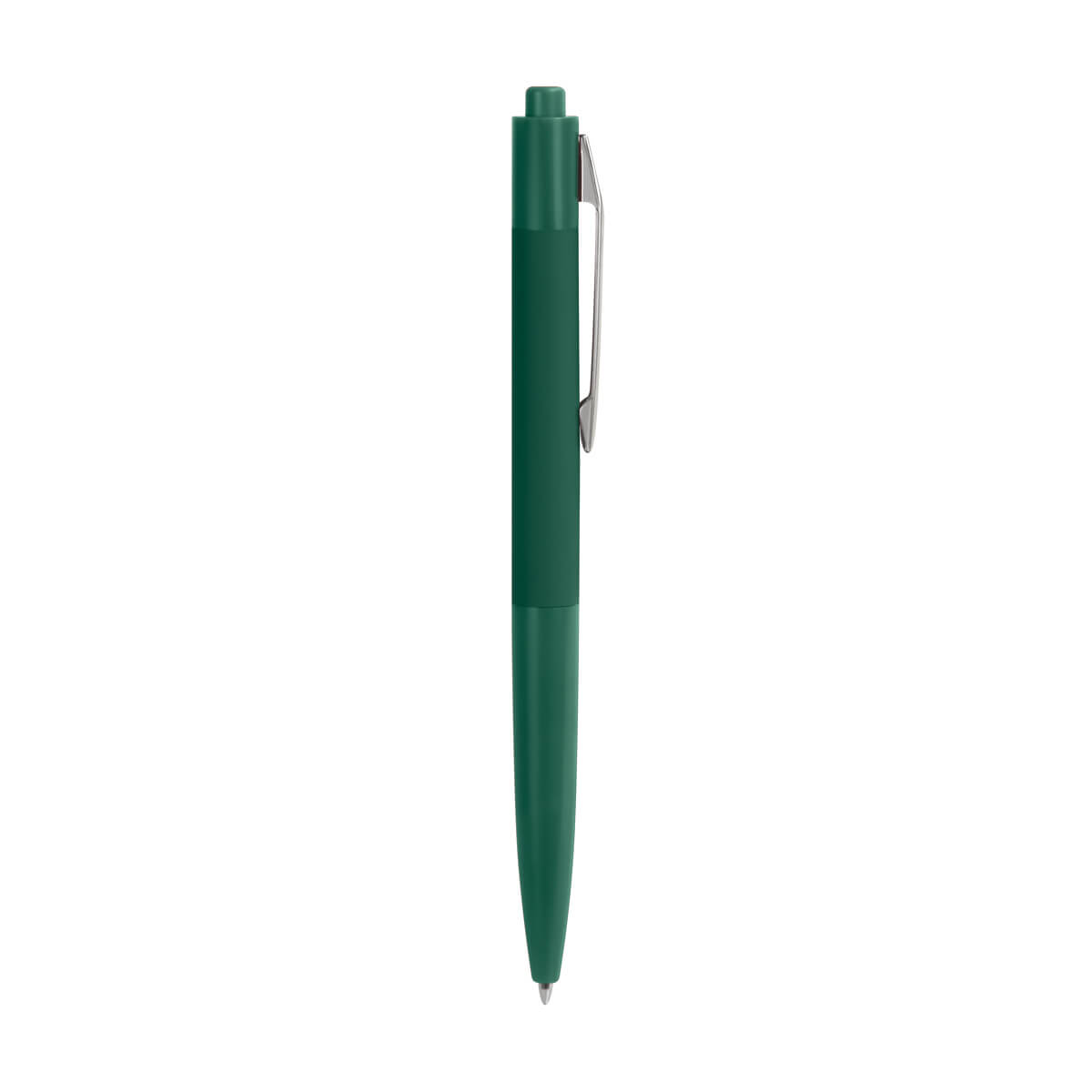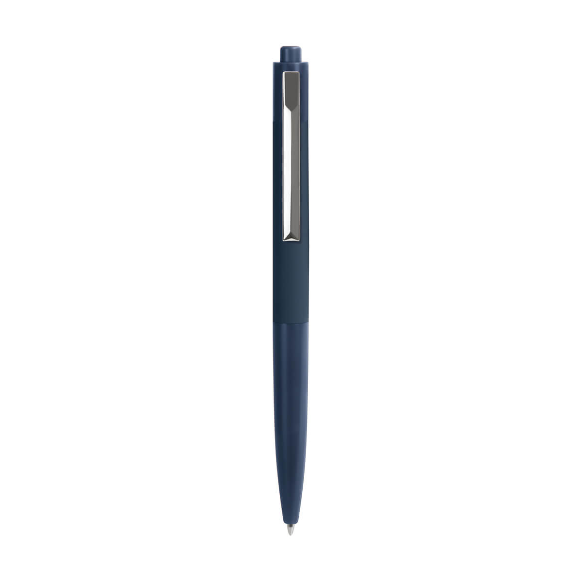 Boligrafo hibrido: mitad metalica y mitad de plastico. Acabado suave al tacto y mecanismo pulsador.