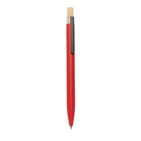 Bolígrafo con terminado tipo rubber. Mecanismo pulsador y botón de madera.