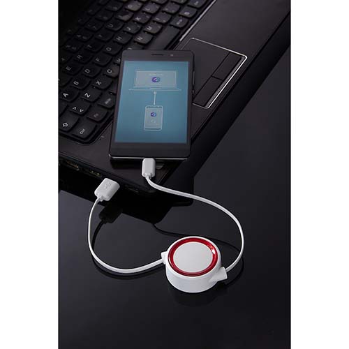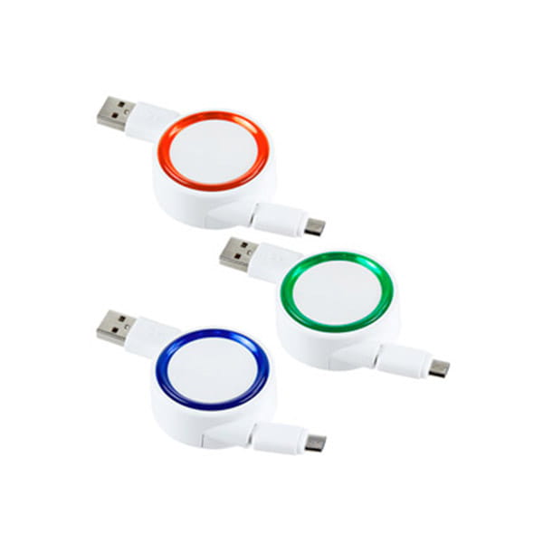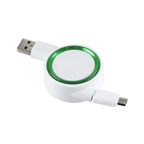 Cable retráctil cargador y para transferencia de datos. Compatible con USB y micro USB. Incluye placa y marco circulares. Longitud de cable 73 cm aprox.