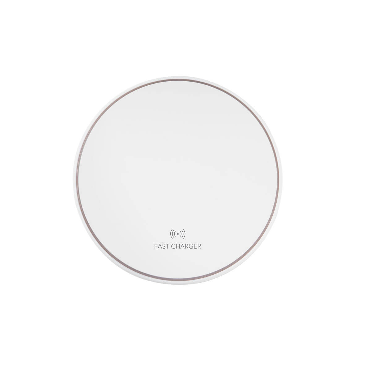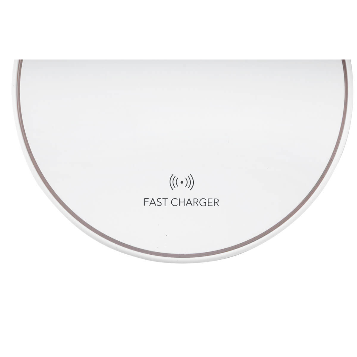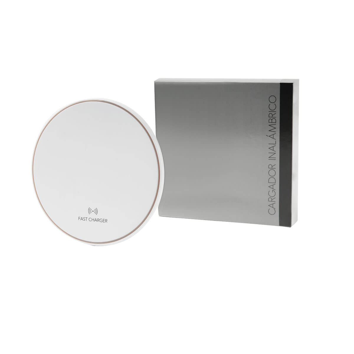 Cargador inalámbrico FAST CHARGE. Velocidad máxima de carga 15 W. Iluminación en color verde cuando está en reposo, iluminación azul cuando está en proceso de carga. Incluye cable auxiliar tipo C y caja individual. Medida: 10 x 10 cm