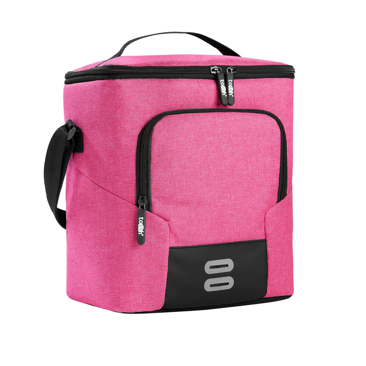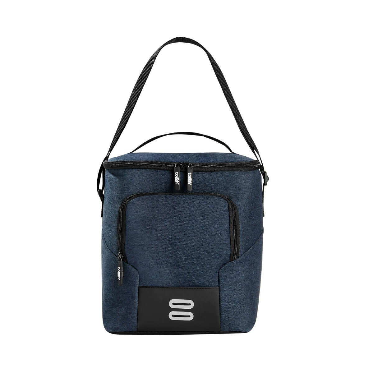 Hielera con interior plastificado y sellado. Bolsa principal y bolsa frontal con cierre. Incluye asa de agarre superior y correa para hombro ajustable.