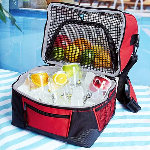HIELERA JENA(Interior plastificado impermeable. Bolsa principal y frontal. Bolsa lateral de red. Red interna para separar.)