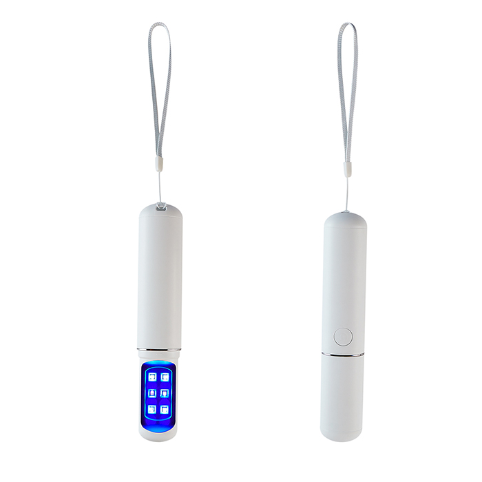 Lámpara portátil para esterilización UV. Incluye cable cargador USB y sujetador. No reflejar la luz UV directo a tu cara o piel.