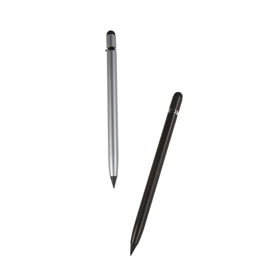 Bolígrafo infinito con recubrimiento metalizado y tapón de plástico. Incluye touchscreen y parte superior desprendible con borrador en su interior.