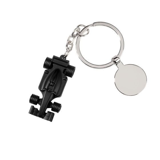 Llavero metálico con diseño de coche de carreras. Incluye placa metálica circular para grabado y caja individual.