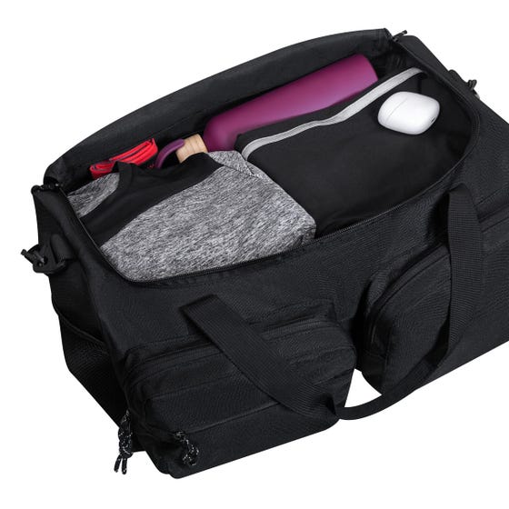 Maleta estilo deportiva con bolsa principal y frontal con cierre, bolsillos laterales de malla, que permiten mayor organizacion de tus articulos personales. Asas de mano y correa para hombro ajustables, para portar comodamente con diversos estilos. Cuenta con un compartimento principal amplio y un bolsillo de malla para separar tus articulos favoritos del resto del contenido. La solucion ideal para un estilo de vida activo.