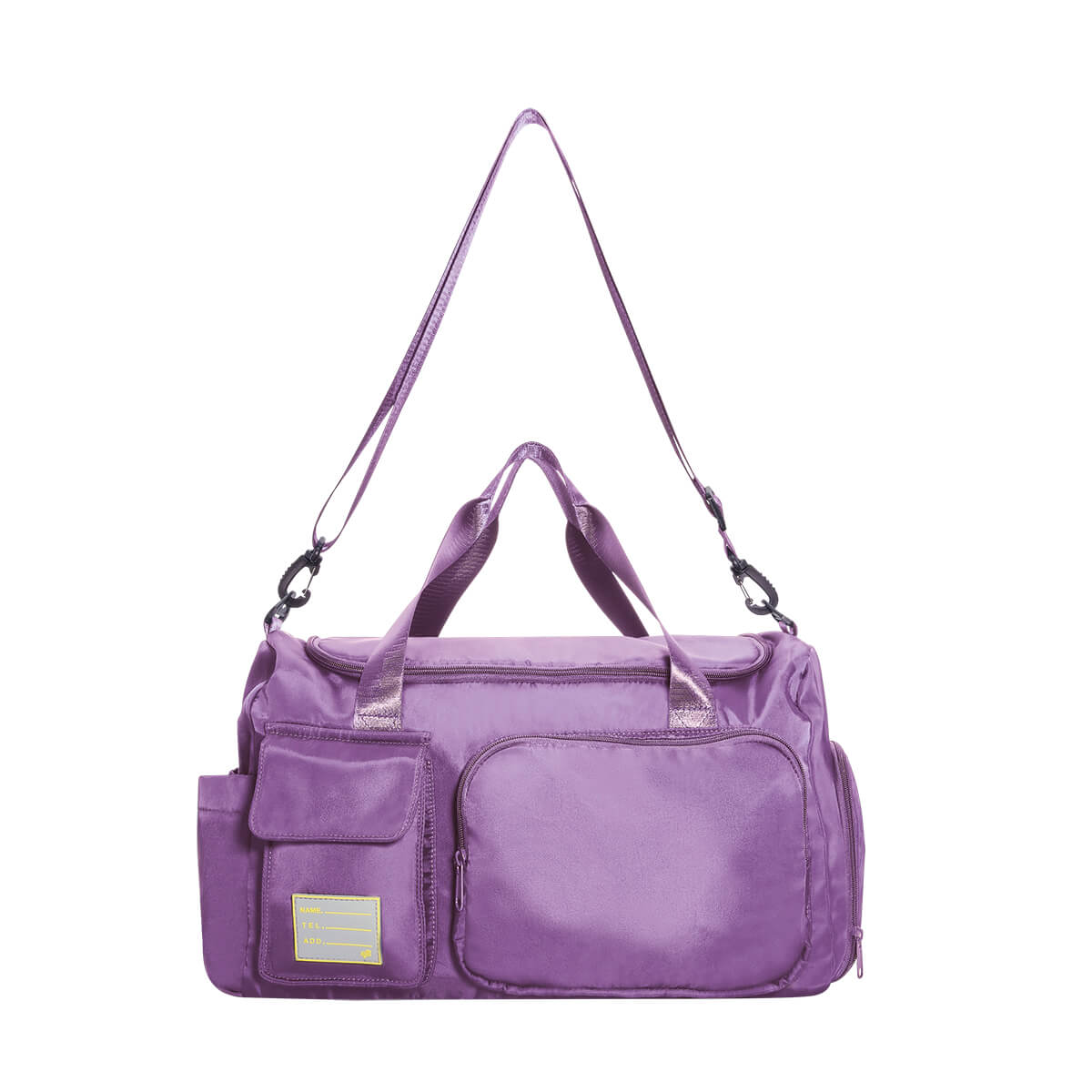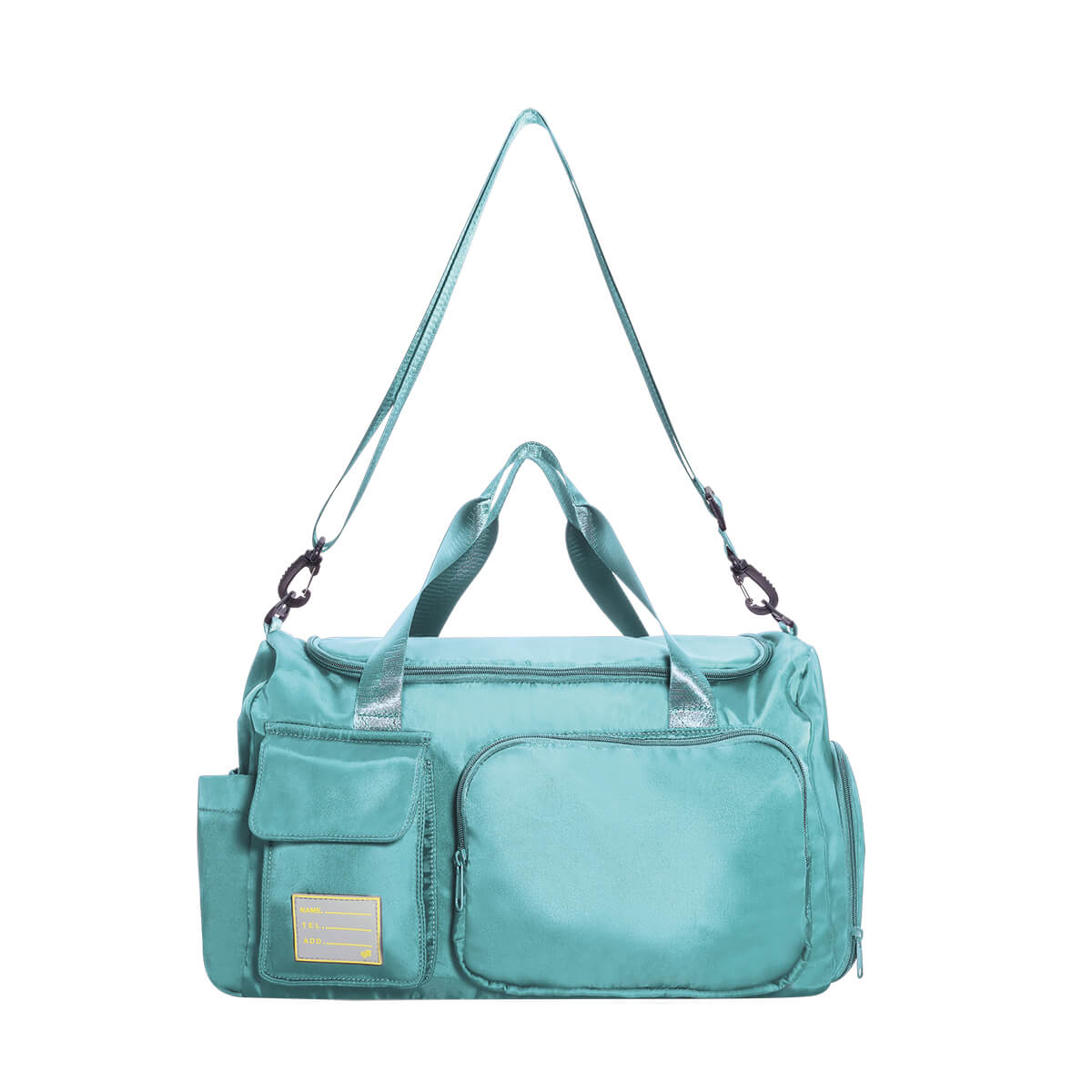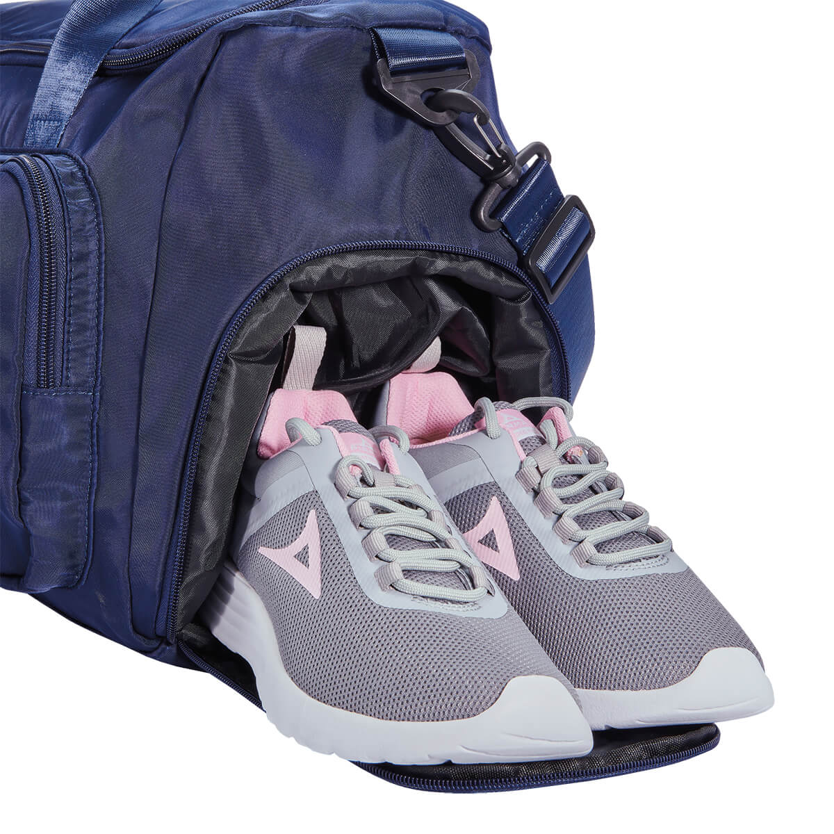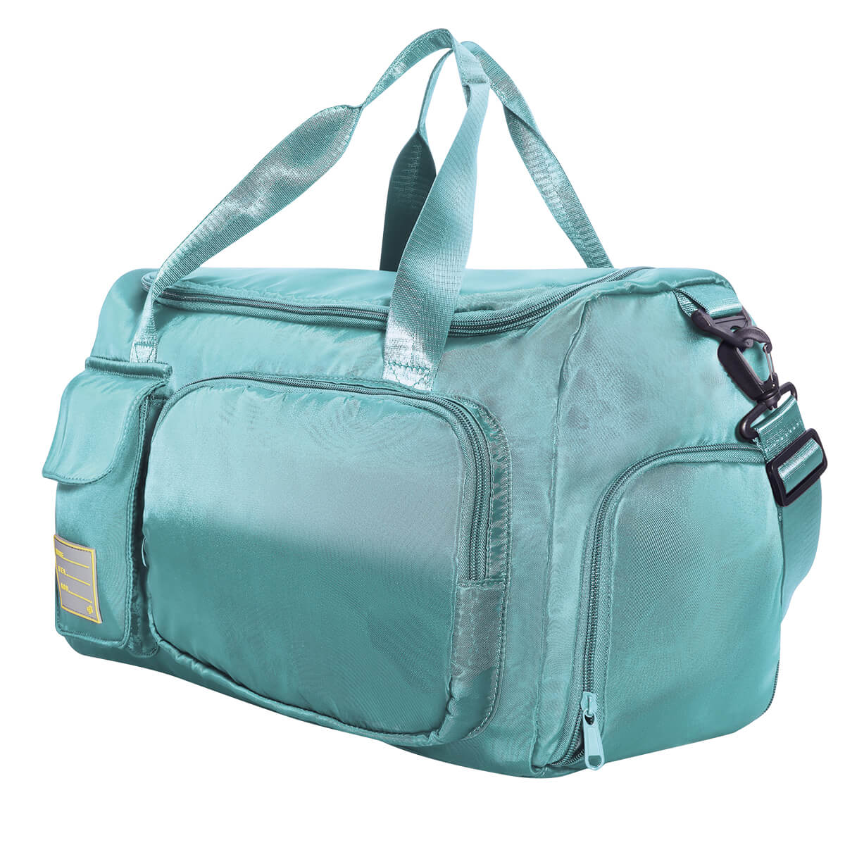 Bolsa principal con cierre y bolsa interior resistente al agua. Bolsillo lateral izquierdo con cierre de velcro y compartimento lateral para zapatos. Doble bolsa frontal. Incluye aditamento especial trasero para poner en trolley y asa ajustable para hombro con broche removible.
