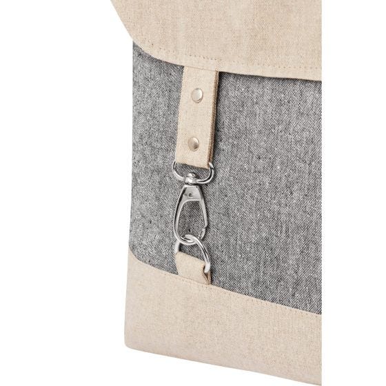 Mochila ecológica de algodón reciclado. Compartimento principal con cerrado de solapa y 2 broches metálicos. Asa superior y asas para hombro ajustables.