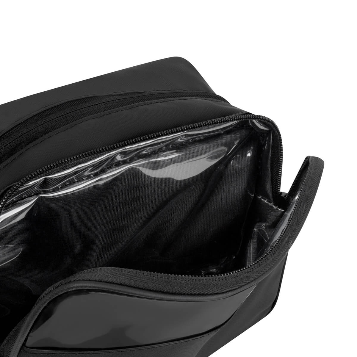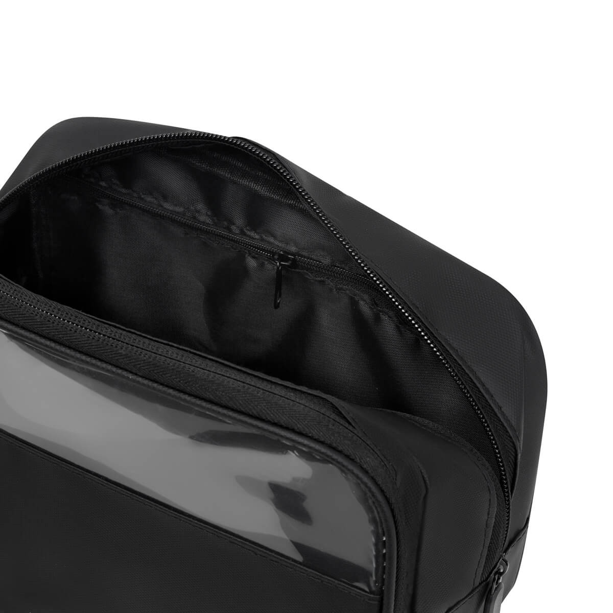 Neceser de poliester resistente al agua. Incluye una mica PVC en el compartimento frontal para una facil visualizacion de su contenido. Dos compartimentos amplios y multiples bolsillos internos para mantener todo perfectamente ordenado. Su asa lateral facilita el transporte, mientras que los pullers de rubber aseguran un cierre comodo y seguro. Ideal para viajes, gimnasio o uso diario.