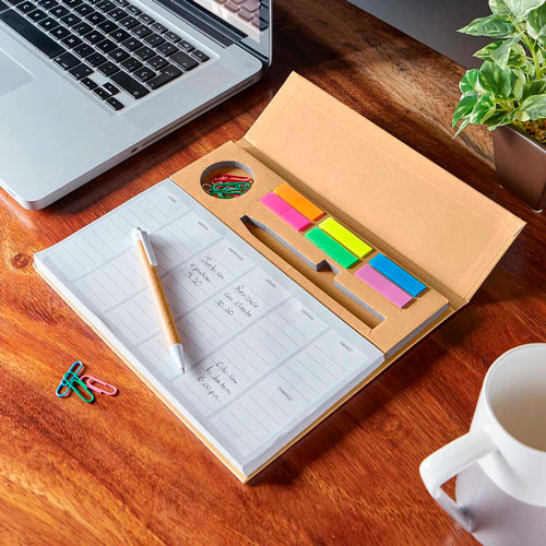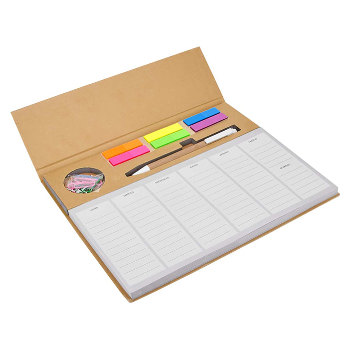 PROGRAMADOR PRISTINA(Programador semanal con 100 hojas. Incluye bolígrafo ecológico, clips y banderillas adheribles de 6 colores.)